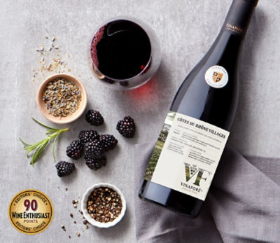 Vinaforé® Côtes du Rhône Villages is an assemblage of 3 different terroirs. The base of the wine 65% comes from Chateauneuf de Gadagne (south Vaucluse), 15% comes from Jonquières (center Vaucluse), and 20% comes from Roaix (north Vaucluse). The average fermentation/maceration time was two weeks with 85% destemmed. The blend consists of 50% Grenache, 35% Syrah, and 15% Mourvèdre. This wine was aged in traditional neutral tank and foudre which allow for the integration of the three varietals.